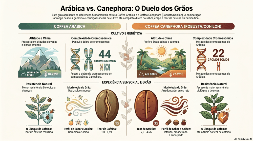 Suas diferenças botânicas, genéticas e agronômicas impactam diretamente o perfil sensorial da bebida final, a adaptabilidade da planta a diferentes ambientes e os métodos de cultivo.