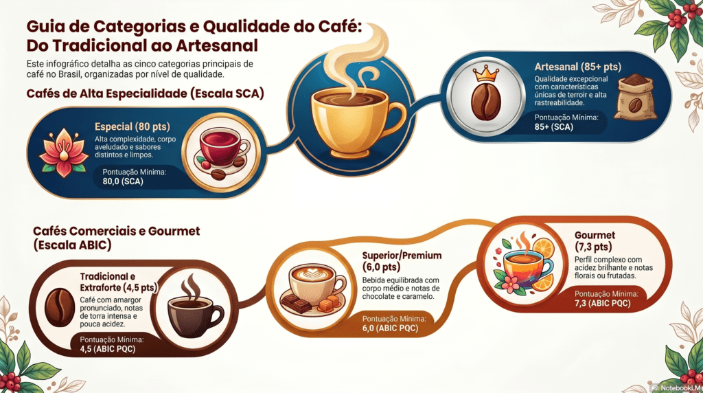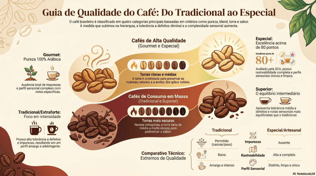 Para compreender a supremacia do café artesanal, precisamos primeiro olhar para as categorias que compõem o mercado brasileiro. O ranking é uma escada de qualidade onde cada degrau representa um aumento no rigor da seleção e na complexidade do sabor.