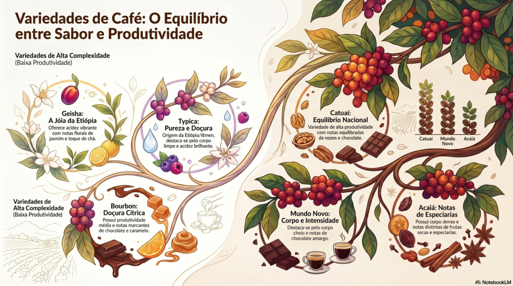 Variedades como Typica, Bourbon, Geisha, Catuaí, Mundo Novo e Acaiá possuem características distintas que influenciam o sabor, a acidez e o corpo da bebida.