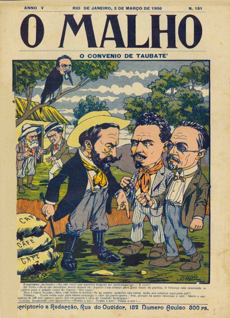 👉 Capa da Revista O Malho, Rio de Janeiro, 1906, número 181. Domínio Público. https://commons.wikimedia.org/w/index.php?curid=121388304