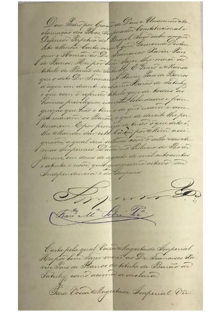 👉 Título de Barão de Tatuí para Francisco Xavier Pais de Barros em 2 de agosto de 1879. Esta obra está em domínio público no Brasil.