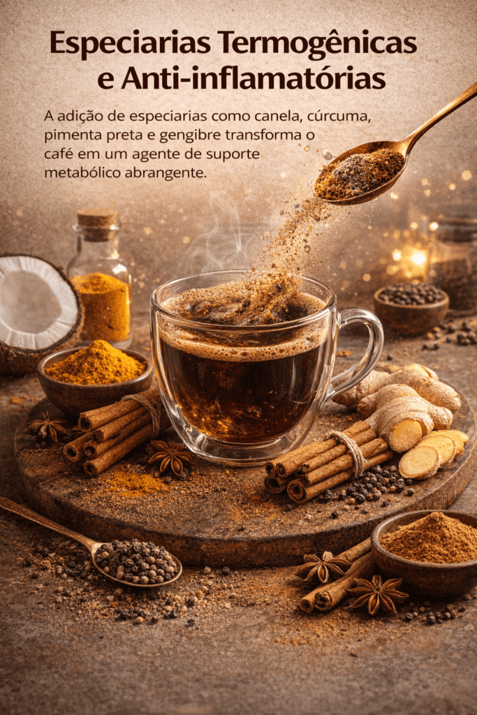 A adição de especiarias como canela, cúrcuma, pimenta preta e gengibre transforma o café em um agente de suporte metabólico abrangente. A canela auxilia na regulação dos níveis de açúcar no sangue, mitigando picos de insulina que podem levar ao armazenamento de gordura.