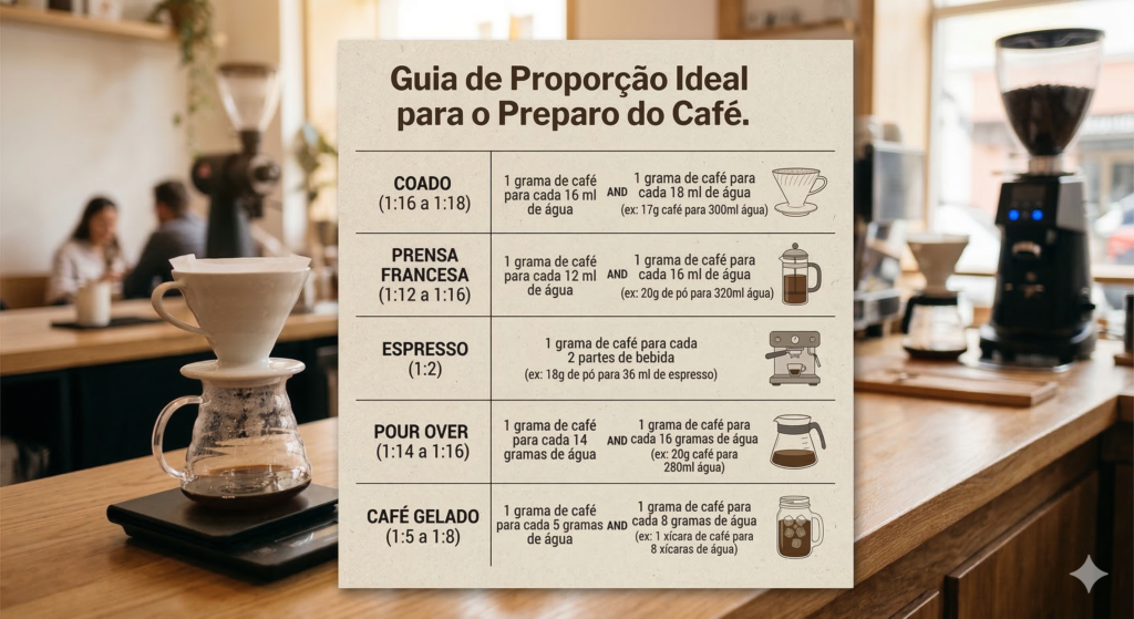 • Proporção Água/Café: O padrão ouro é de 1:16 a 1:18 (ex: 55-60g de café para 1 litro de água). Proporções menores resultam em bebidas pesadas; proporções maiores podem super-extrair, gerando amargor.