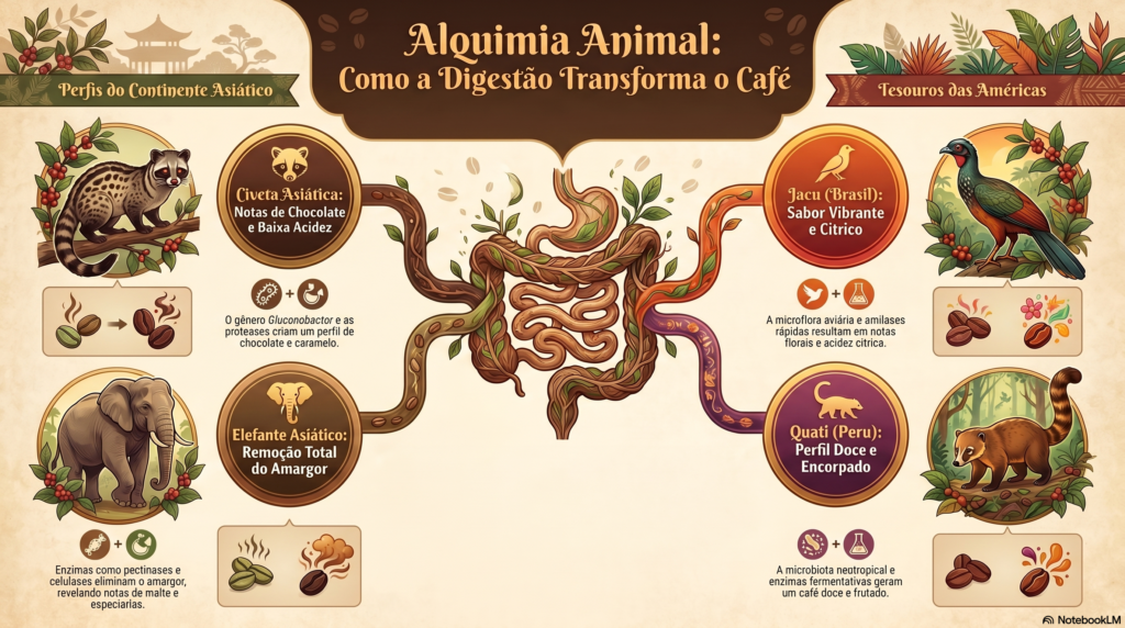 A singularidade dos cafés processados por animais reside na modificação química que ocorre durante o trânsito dos grãos pelo trato digestivo. Ao contrário da fermentação controlada em tanques, a fermentação in vivo submete a cereja do café a uma série de ataques enzimáticos que a ciência moderna mal começou a mapear em sua totalidade.