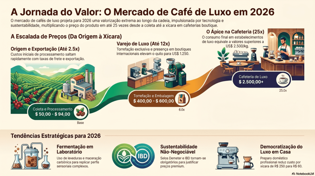 O mercado de cafés exóticos opera sob a lógica dos “Bens de Veblen”, onde o preço elevado aumenta o desejo pelo produto devido ao seu status simbólico. No entanto, o consumidor contemporâneo de 2026 é mais cético e exige “evidências, não slogans”.