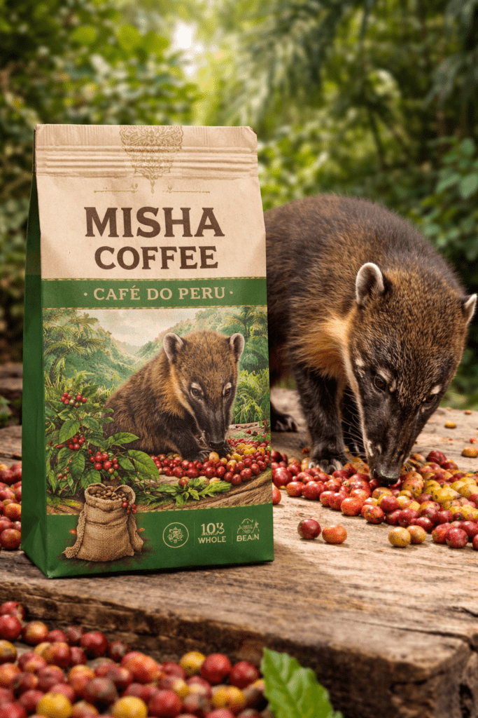 O Misha Coffee, produzido no Peru, utiliza o quati (Nasua nasua), conhecido localmente como “Uchuñari”. O processo é semelhante ao da civeta, mas o quati possui um sistema digestivo que confere notas marcantes de frutas tropicais da selva peruana.