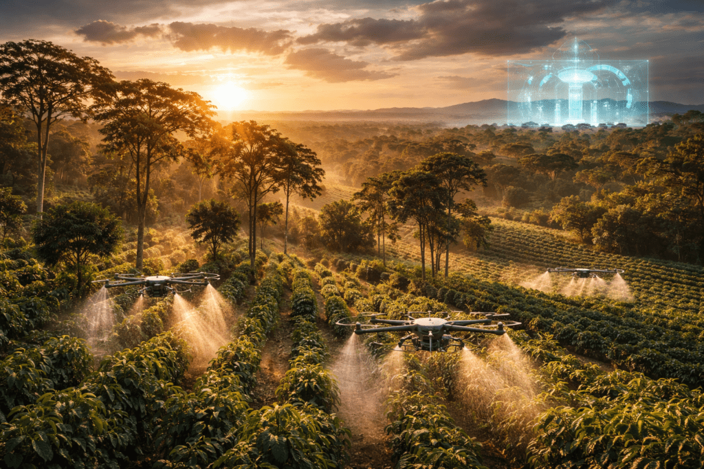 A Quarta Onda do café trouxe a Inteligência Artificial (IA) para o centro da gestão de riscos. Hoje, algoritmos de aprendizado de máquina cruzam dados de satélite, estações meteorológicas locais e sensores terrestres para prever com precisão eventos climáticos extremos. Essas ferramentas permitem que o produtor tome decisões preventivas, como a aplicação de protetores térmicos foliares ou a ativação antecipada de sistemas de irrigação antes que o estresse hídrico se torne irreversível.
