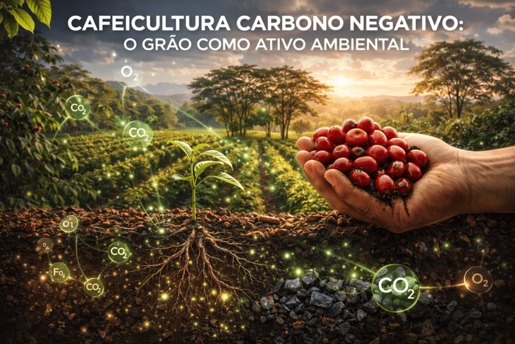 O conceito de café carbono negativo está ganhando força no mercado de luxo e nas bolsas de valores ambientais. O produtor que consegue comprovar que sua fazenda remove mais CO2 da atmosfera do que emite passa a ter acesso a uma nova fonte de renda: os créditos de carbono.