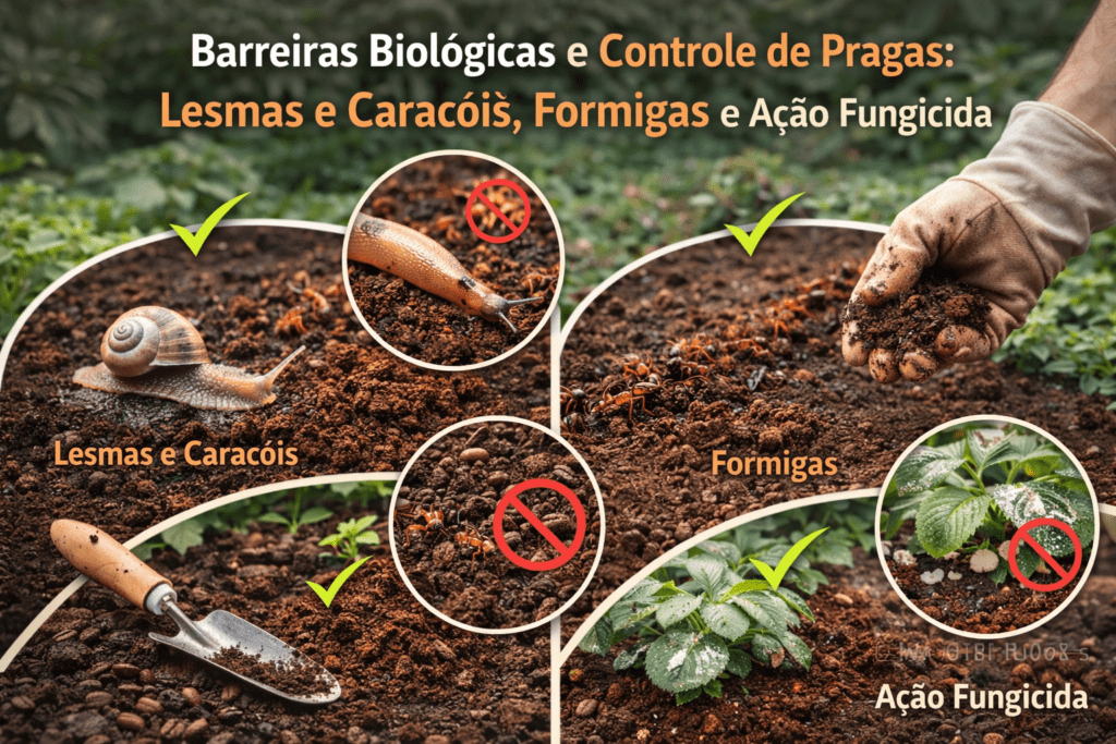 1. Lesmas e Caracóis: Uma barreira de 3 a 5 cm de largura ao redor das plantas cria uma zona que esses gastrópodes evitam cruzar devido à irritação física e química.