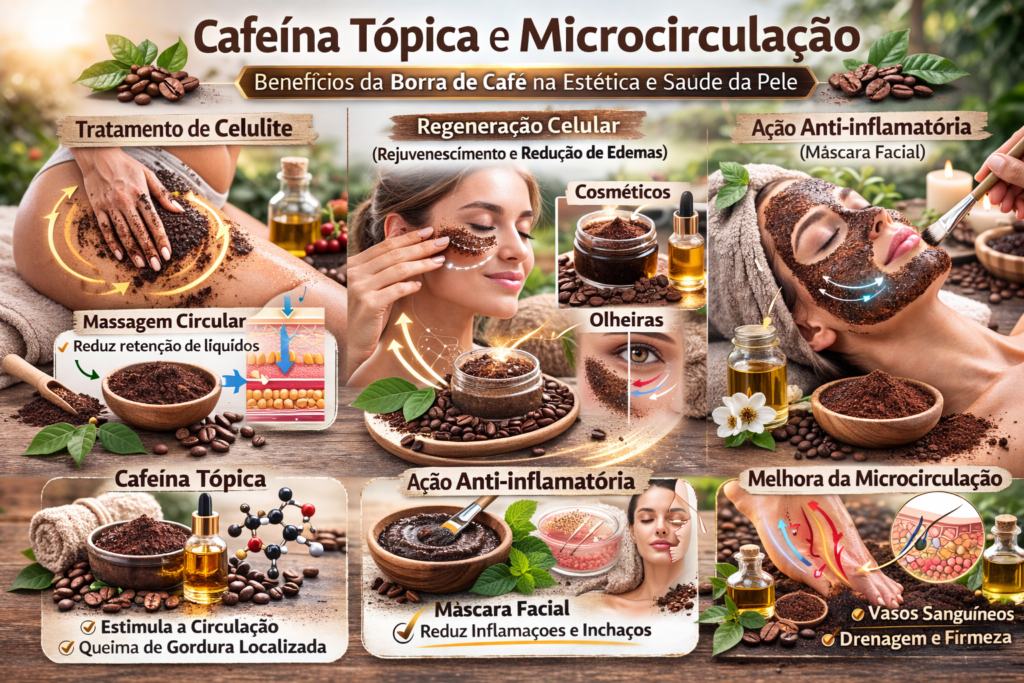 • Tratamento de Celulite: A massagem circular com borra de café (pura ou misturada com óleos de amêndoas) ajuda a reduzir a retenção de líquidos e a aparência da celulite em regiões congestionadas.